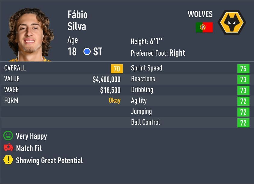 Fabio Silva is a Portuguese forward who is part of Wolves' roster in the Premier League. The striker was acquired for a club-record fee on a 5-year deal, showing the club's faith in his potential. The 18-year-old can develop into a top striker with an 85-overall rating on FIFA 22 Career Mode.
