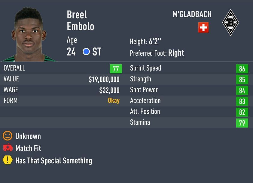 Breel Embolo is a 24-year-old Swiss international who represents Bundesliga side Monchengladbach as a forward. The striker has massive strength (85) with explosive speed (86) and shot power (84) with good positioning (82) skills. Embolo has a potential of 82 in FIFA 22 Career Mode.