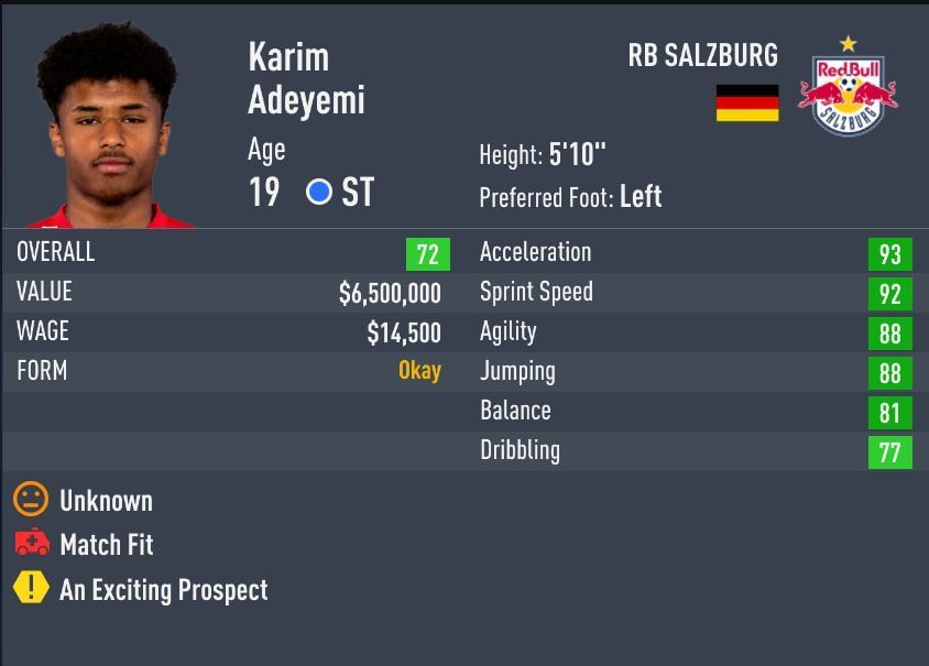 The 18-year-old striker is a proficient goalscorer for club side RB Salzburg. The player already has ten goals in 11 matches for his club in the Austrian Bundesliga. Adeyemi draws comparisons to Timo Werner's playstyle due to identical attributes in pace (90), agility (88) and dribbling (75).