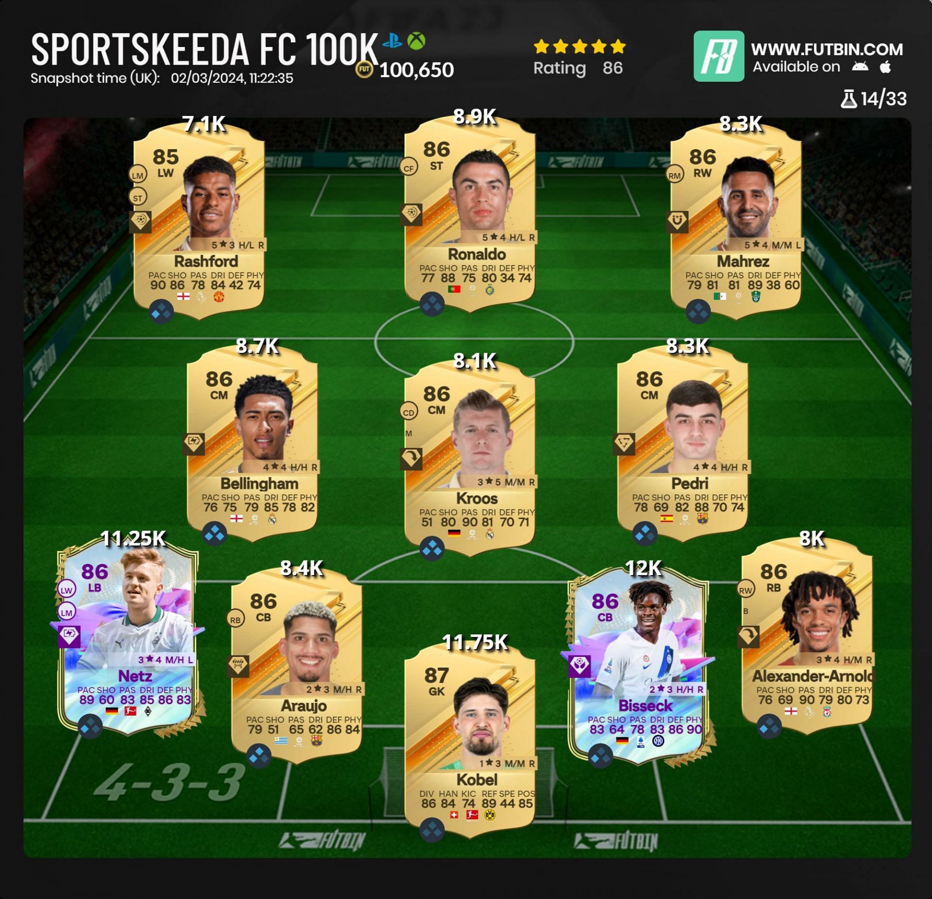 Notably, the increased budget allows for the inclusion of elite base card options and highly-rated players like Cristiano Ronaldo and Toni Kroos to bolster the lineup. Here's the recommendation for the best 100k EA FC 24 starter squad:
