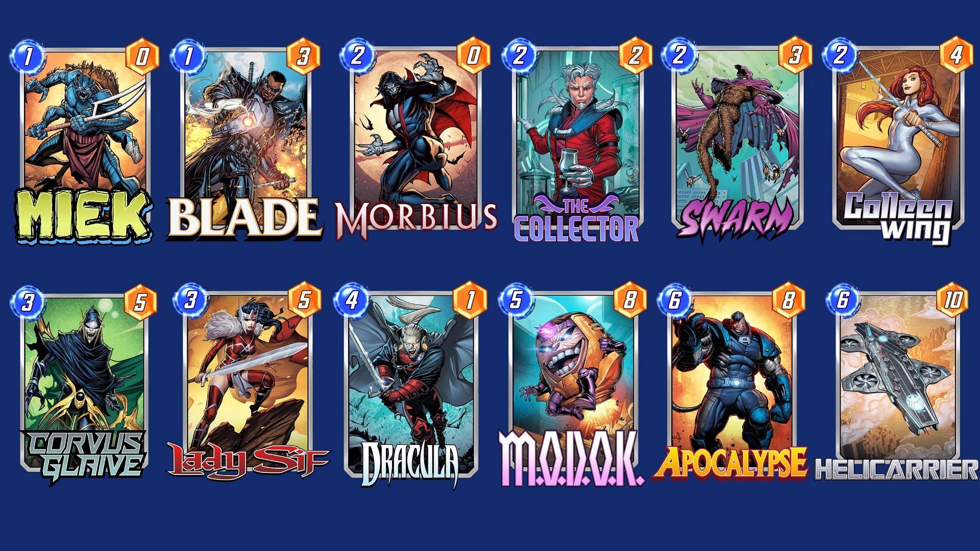 This deck focuses on discarding cards to power up Morbius and Apocalypse while utilizing Dracula to potentially draw high-power cards at the end of the game.