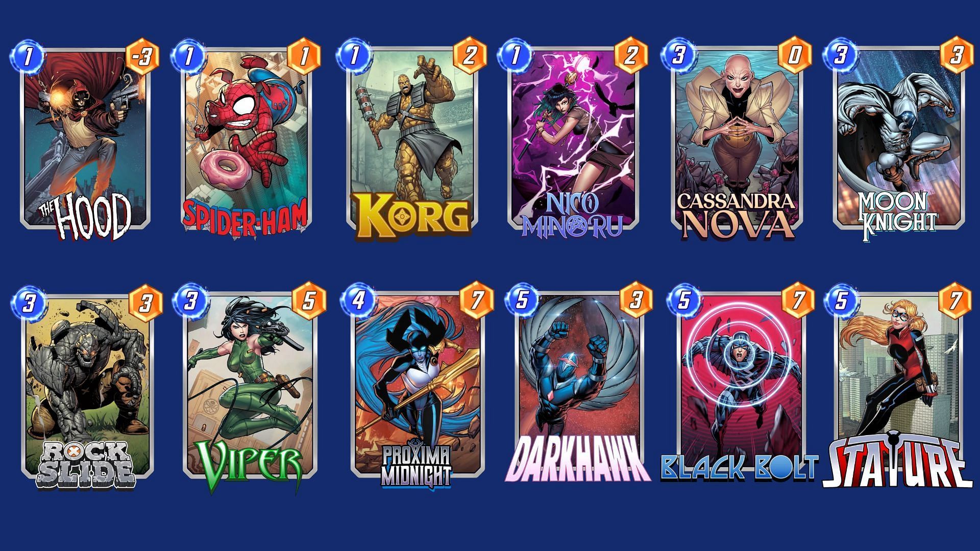 This Marvel Snap deck leverages the synergy between Darkhawk and Proxima Midnight, focusing on controlling the board while utilizing cards that manipulate your opponent's hand and board state.