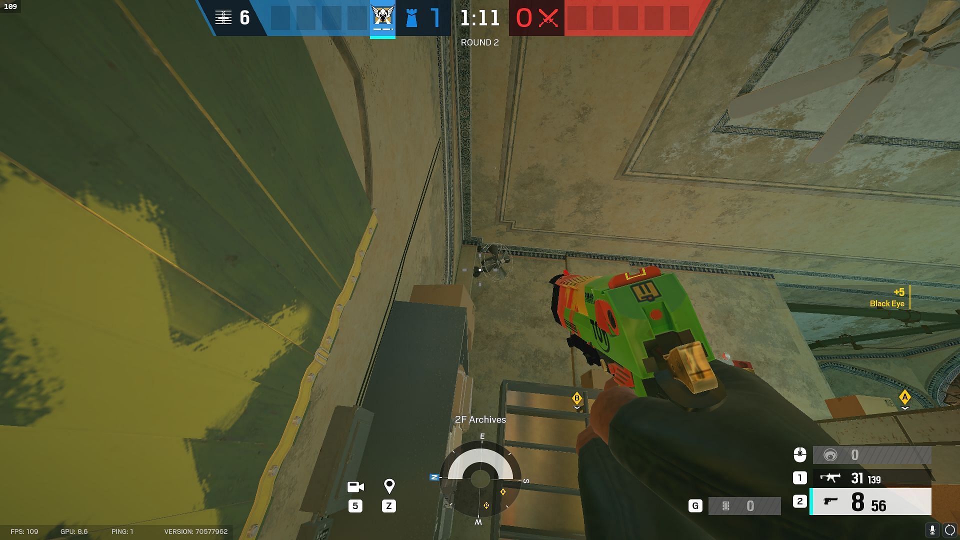 Attaching the Black Eye behind the Security room monitors can be tricky, but can give you the edge when defending 2F Armory, or expecting vertical play from Security. To put up the camera, you need to make holes in the 1F Detention ceiling as shown in the image, and throw the camera right behind the monitor racks inside 2F Security.