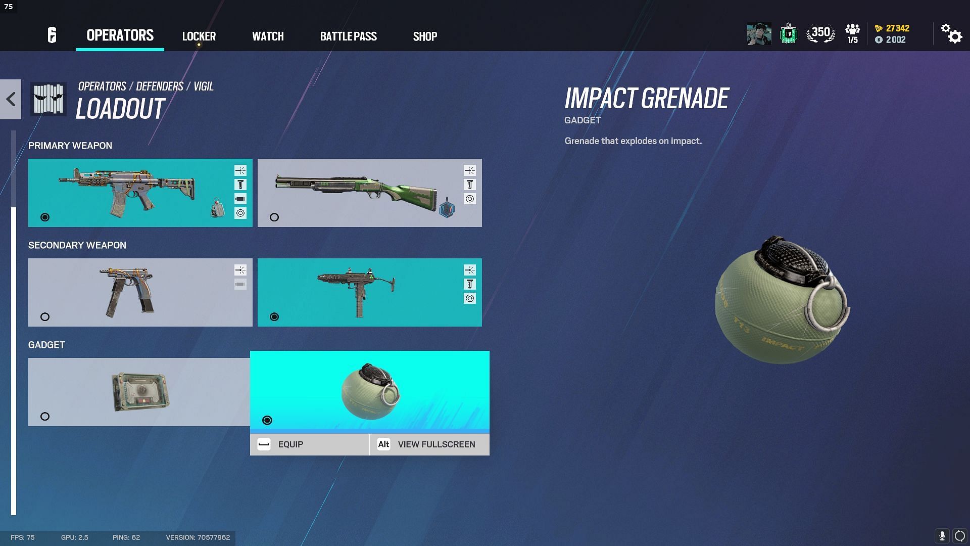 For secondary gadgets, you can run the Impact Grenade on Vigil, as it suits his play style the most. As he is a more roaming-focused Operator, the Impact Grenade helps him make quick rotations and open hatches when trying to get out of a sticky situation.