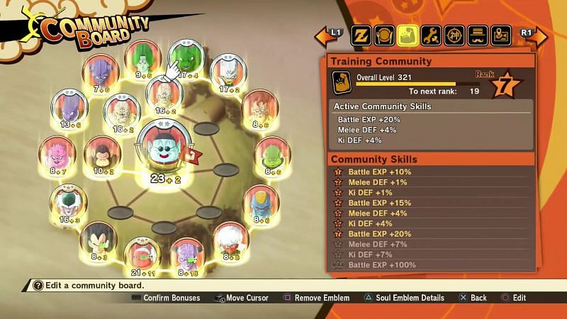 The Adult DBZ Kakarot Community Board has 9 Soul Emblem slots. The "leader" is Master Roshi who cannot be removed. An overall level of 225 is required to reach Max Rank. This board is useful for cheaper items, getting better selling price on items and gaining "Frenzy" during battles.
