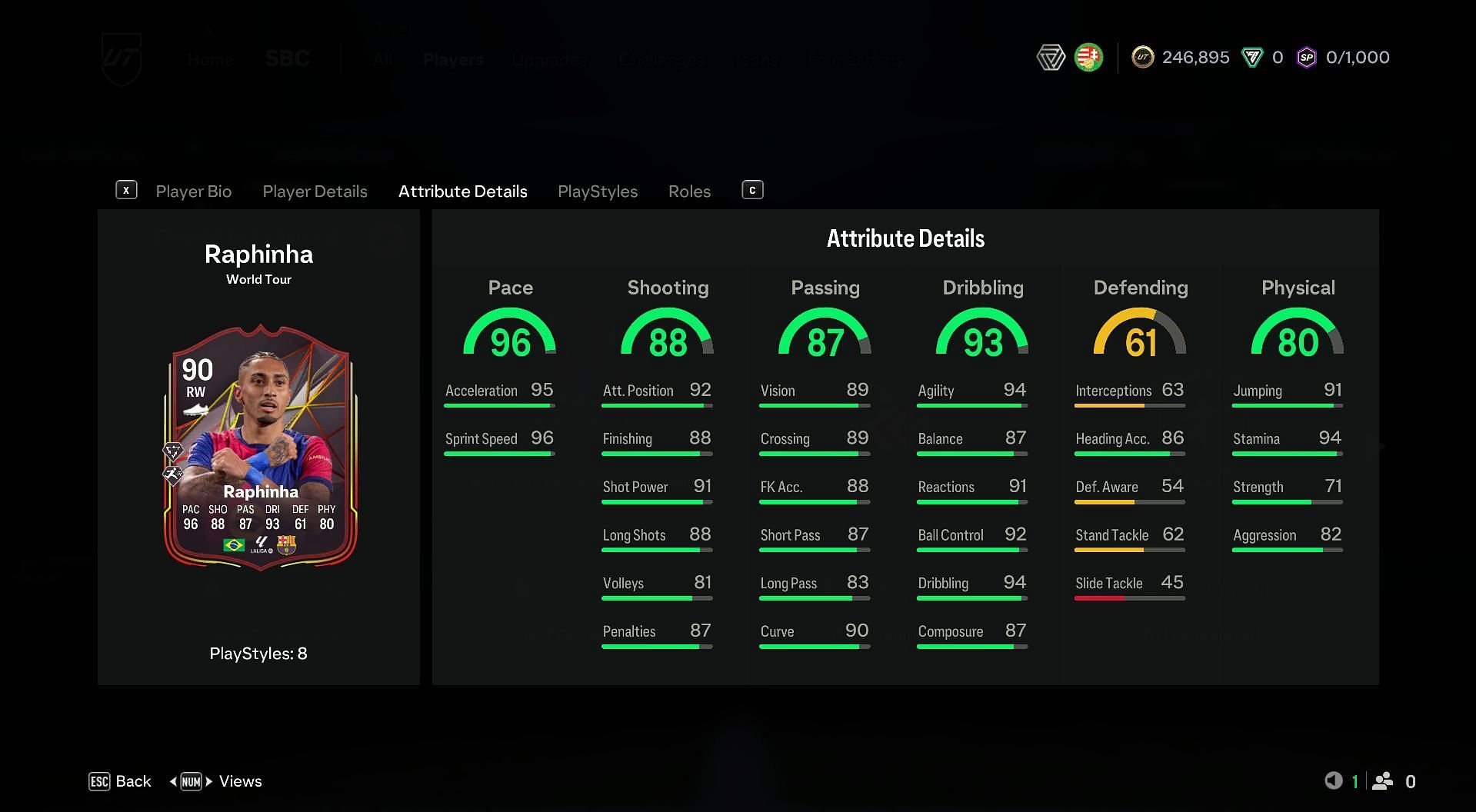 The overall cost to complete the EA FC 25 Raphinha World Tour SBC is around 600,350 EA FC Coins. Considering these exceptional attributes, it's worth the price.