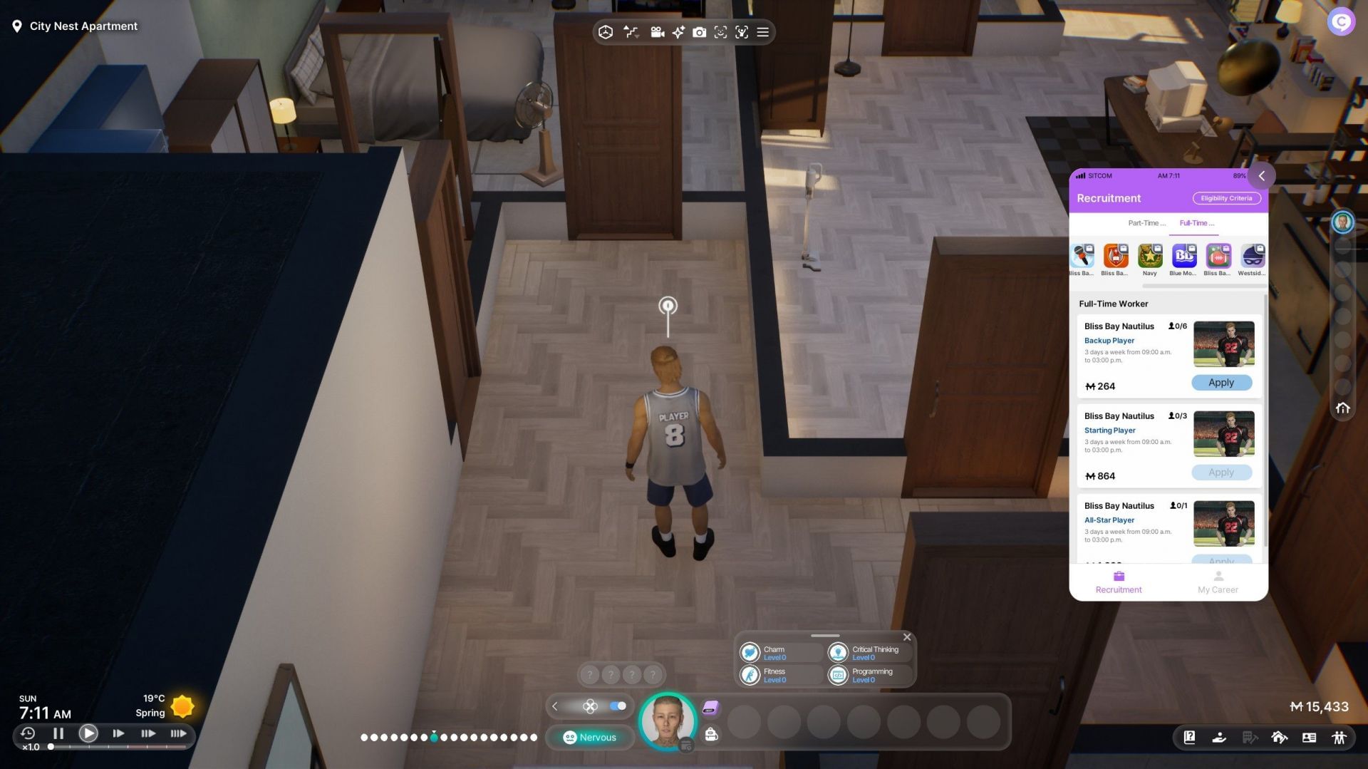 Since this job is an off-site position, there is no physical location for work, meaning Zois will commute to and from their workplace on their own. Also, this career path is only available in Bliss Bay, which means that the playthrough will require you to choose this city. To become a Football Player, open up your in-game smartphone and look for a purple app at the bottom of the screen.