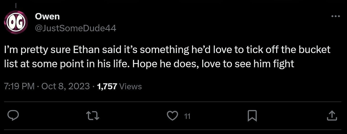"I'm pretty sure Ethan said it's something he'd love to tick off the bucket list at some point in his life. Hope he does, love to see him fight."