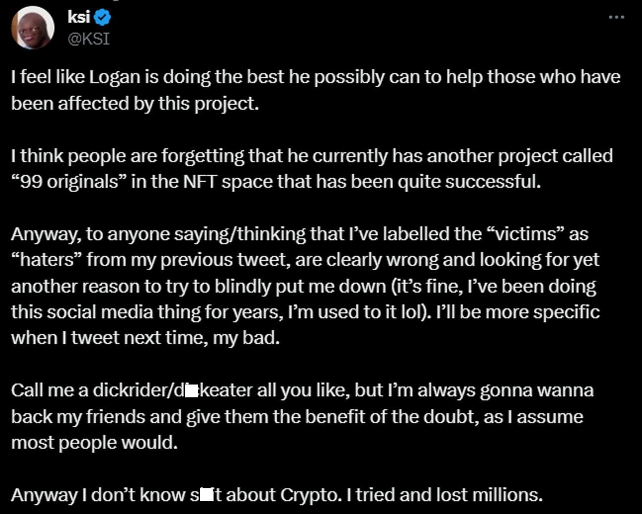 British YouTuber JJ "KSI" took to his official X account to voice support for his friend and business partner Logan Paul. For those out of the loop, the content creator has been facing criticism after announcing his crypto buyback initiative in the aftermath of the failure of his CryptoZoo NFT project (which he and his team launched in 2021).