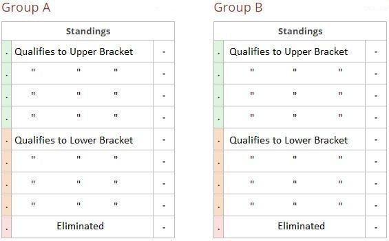 The group stages will begin on August 15th and conclude on August 18th. A team will face every other team in it's group in a Best of 2 series. The top 4 teams of each group will go on to the upper brackets and the next 4 will comprise of the lower bracket. The last placed team on each group will get eliminated. A pictorial representation is given below: