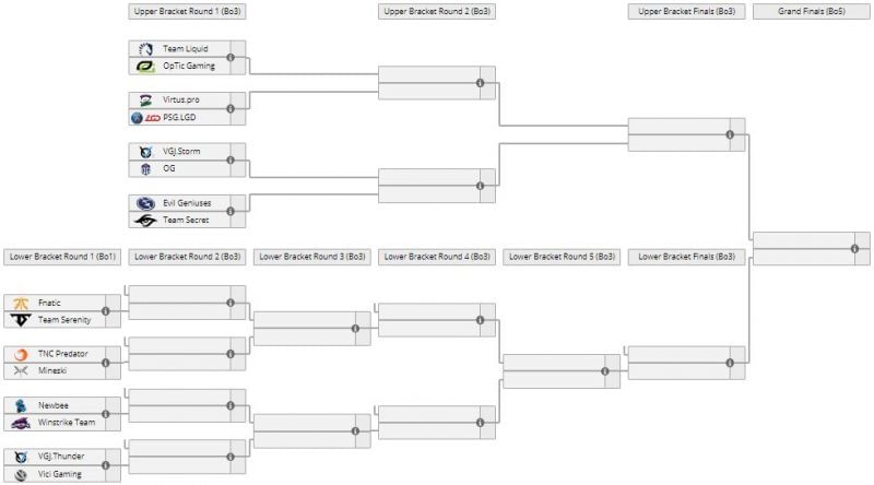 The Upper Bracket teams have a distinct advantage in this format. If any team loses in the Upper Brackets, they simply drop down to the Lower Bracket stage vertically below them. For example, if Team Liquid were to lose to Optic Gaming, they would find themselves in Lower Bracket Round 2. If any team loses in the Lower Bracket, it is over for them. All games are best of 3 except the Lower Bracket Round 1 which is Best of 1 and the Grand Finals which will be Best of 5.