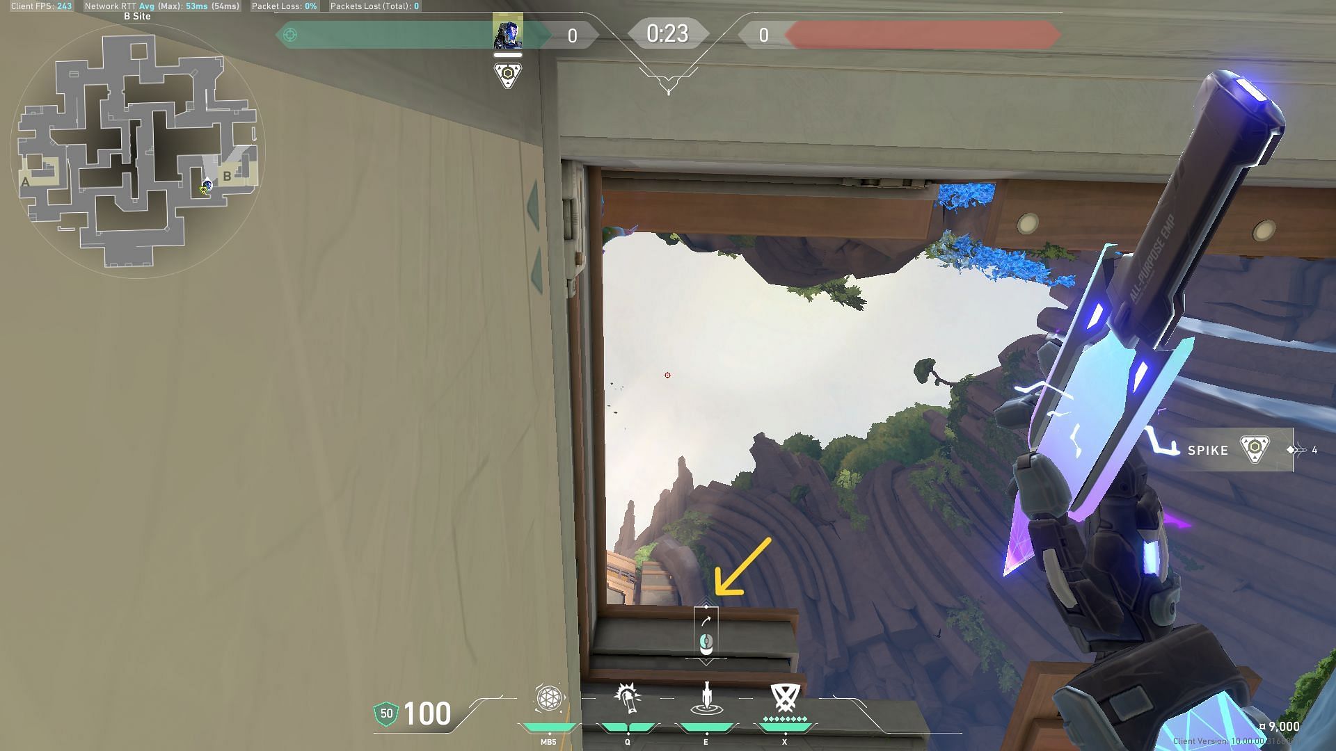 Move your crosshair upwards and place it at the bottom of the rock as indicated in the picture. Equip the Zero/Point blade and use the left click to throw. The blade will land on the default plant spot at B-site.