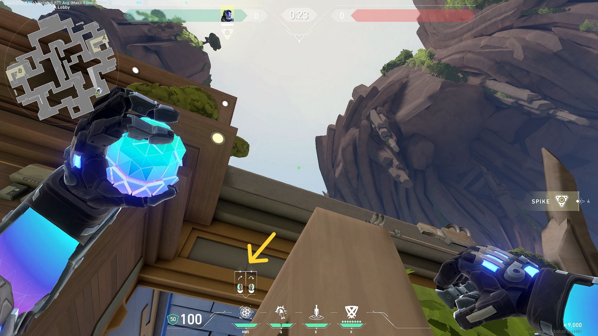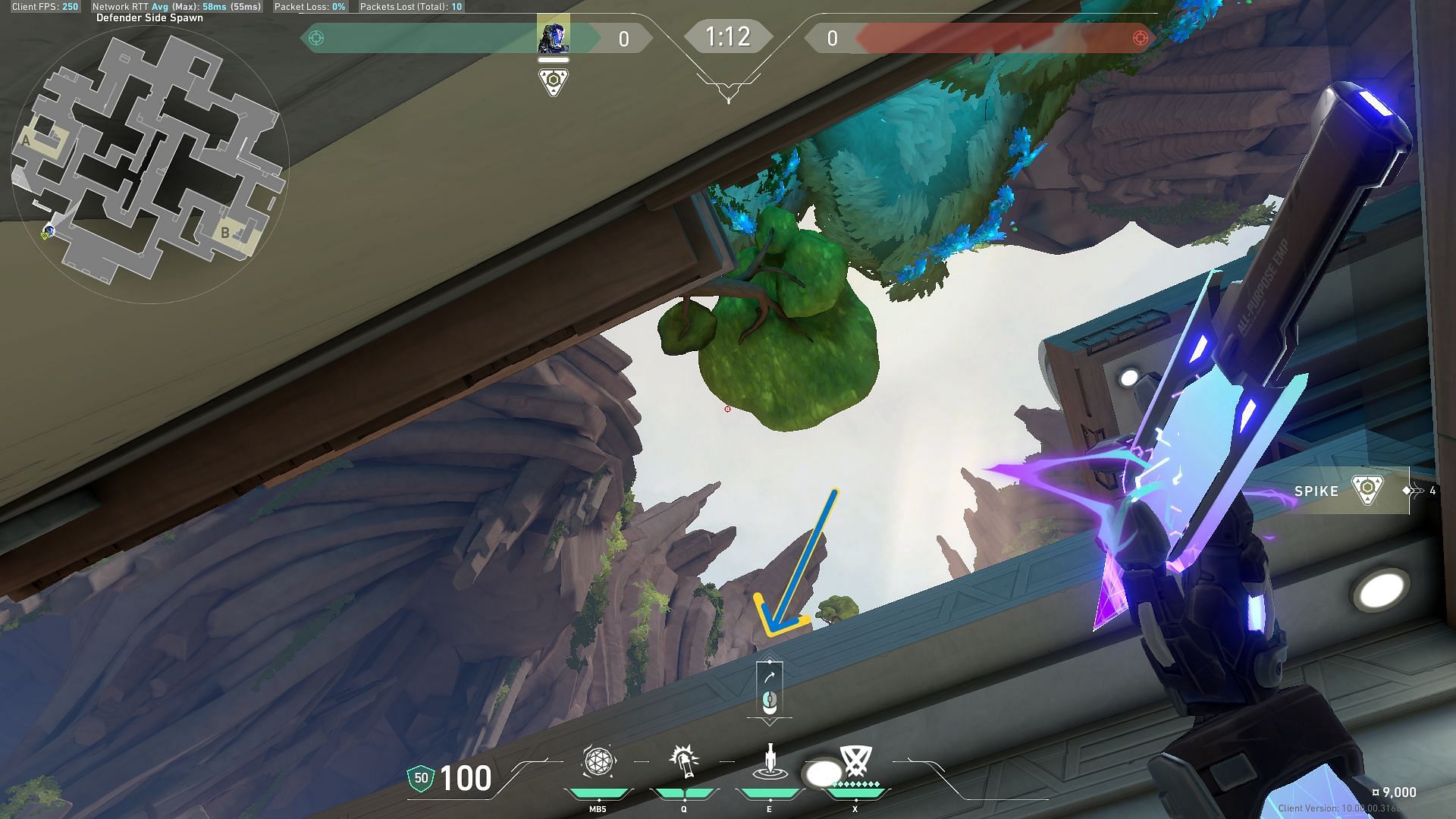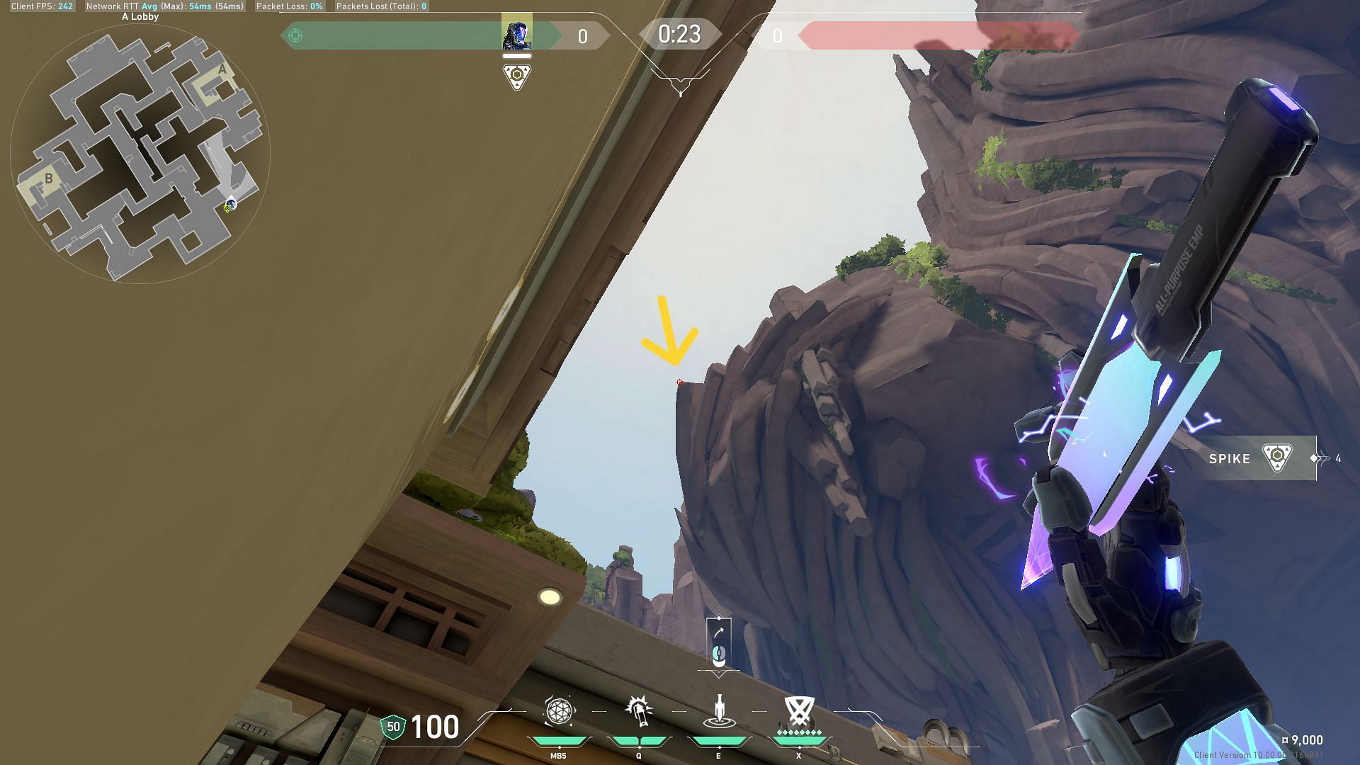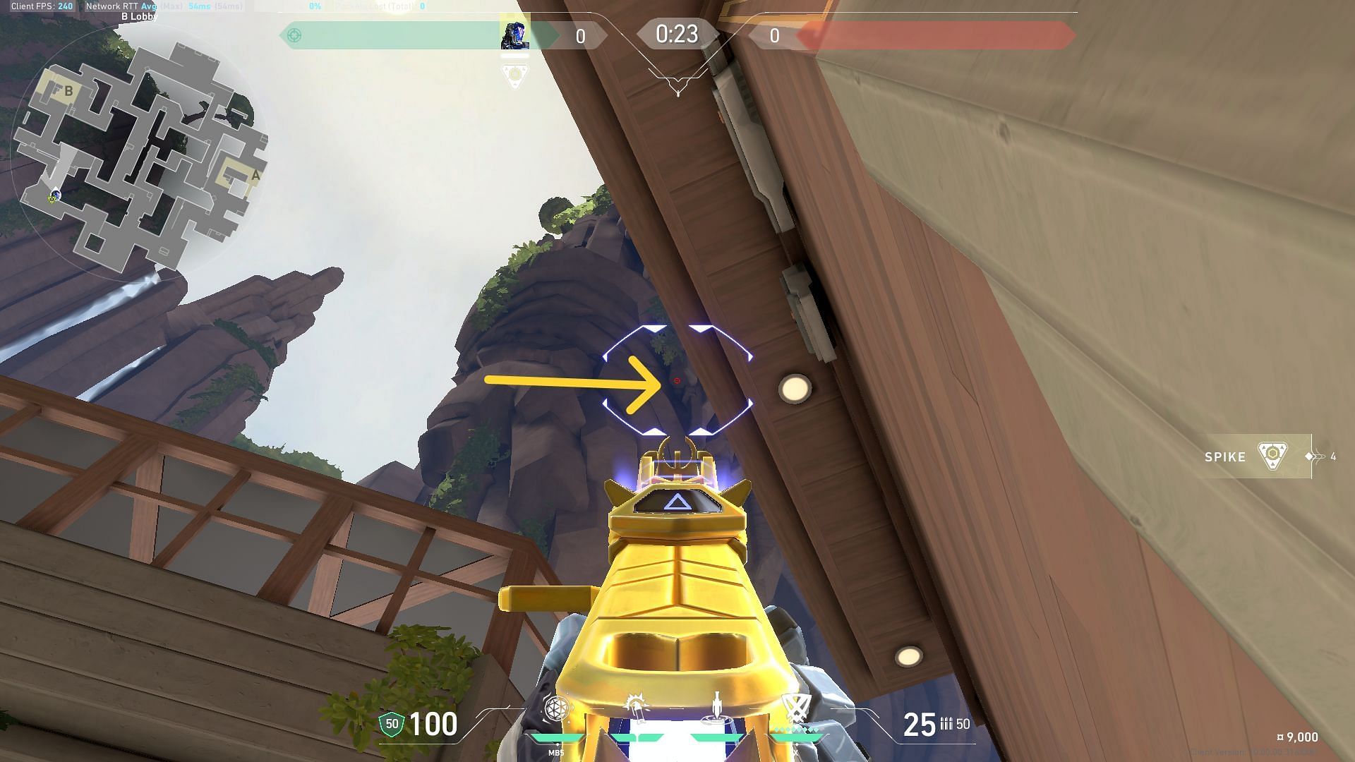 Equip the Zero/Point knife and move the crosshair above as indicated in the picture. Left-click to throw the blade upwards and let it land on A-Bridge in Valorant’s Abyss map.