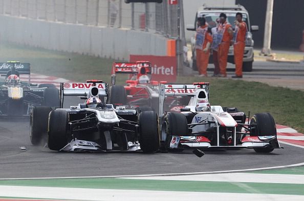 NOIDA, INDIA – OCTOBER 30: Rubens Barrichello of Brazil and Williams loses his front wing in a collision with Kamui Kobayashi of Japan and Sauber F1 at the start of the Indian Formula One Grand Prix at the Buddh International Circuit on October 30, 2011 in Noida, India.