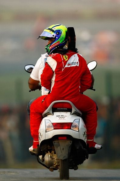 NOIDA, INDIA – OCTOBER 30: Felipe Massa of Brazil and Ferrari is given a lift back to the pits after crashing out during the Indian Formula One Grand Prix at the Buddh International Circuit on October 30, 2011 in Noida, India.