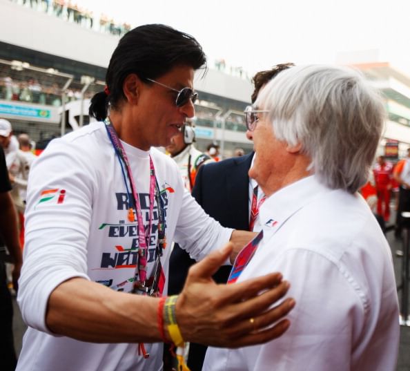 NOIDA, INDIA – OCTOBER 30: F1 supremo Bernie Ecclestone and Bollywood actor Shahrukh Khan are seen on the grid before the Indian Formula One Grand Prix at the Buddh International Circuit on October 30, 2011 in Noida, India.