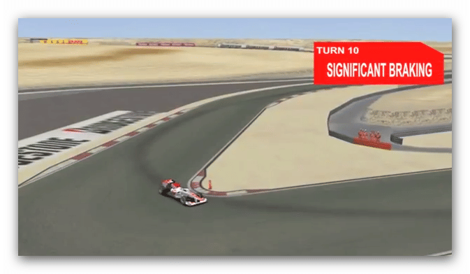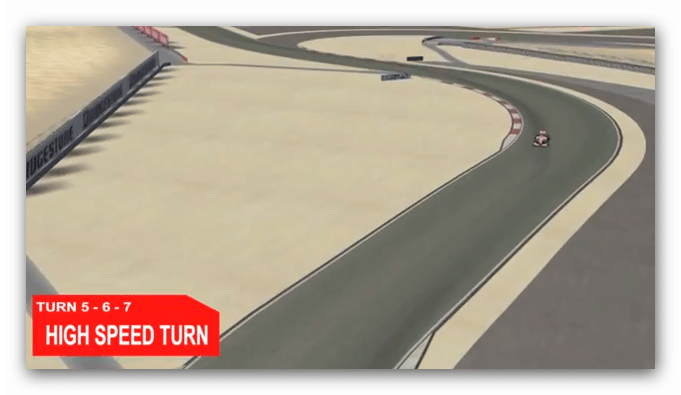 Turns 9 and 10 is where bulk of time can be made or lost and is the most important corner of the Bahrain circuit. Getting a good exit out of turn 10 is also very important to make the most of the straight leading out from turn 10. Also, in the race, the straight from the exit of turn 10 can be used for overtaking opportunities.