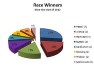 The following pie chart shows the race winners of all F1 Grands Prix since the outset of the 2012 season and the percentage of the races they have claimed: