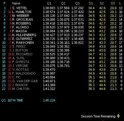 There were no surprises in Q1 as all the expected teams made it to Q2, leaving the Marussias, the Caterhams and the Williams occupying the last 6 places on the grid. Kimi Raikkonen was the fastest in Q1, while Romain Grosjean and Mark Webber finished 13th and 15th respectively, with times just above the drop zone. Webber was on medium tyres, which might explain his place in 15th.