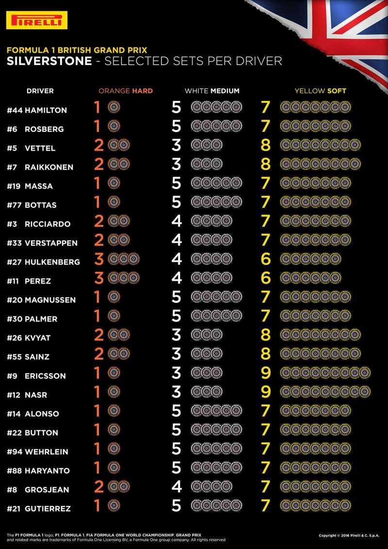 After intense races in Baku and Spielberg, Formula One moves to Silverstone. Rosberg snatched the maiden win in Azerbaijan with Vettel and Perez in tow. For Austria, the Ultra Soft tires were the popular choice with Ferrari and Renault going for 9 sets, Mercedes and Manor going for 8 sets, Haas going for 6 sets and the other teams selecting 7 sets of Ultra Softs. The Super Soft and Soft tire selections varied between all the drivers.