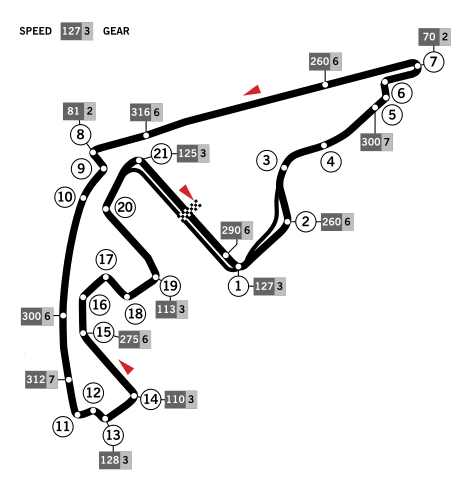 There are two DRS-assisted overtaking zones. The first has a detection point 40m ahead of turn 7 and activation 390m after the turn, heading into the long back straight along the North Grandstand. The cars decelerate from 320 kmph to 80 kmph under heavy breaking for the double 90-degree corner, which is a potential overtaking zone. The second DRS zone is detected after turn 9, with activation on the apex of turn 10. The tyres on offer this weekend were the soft options and medium prime compounds.