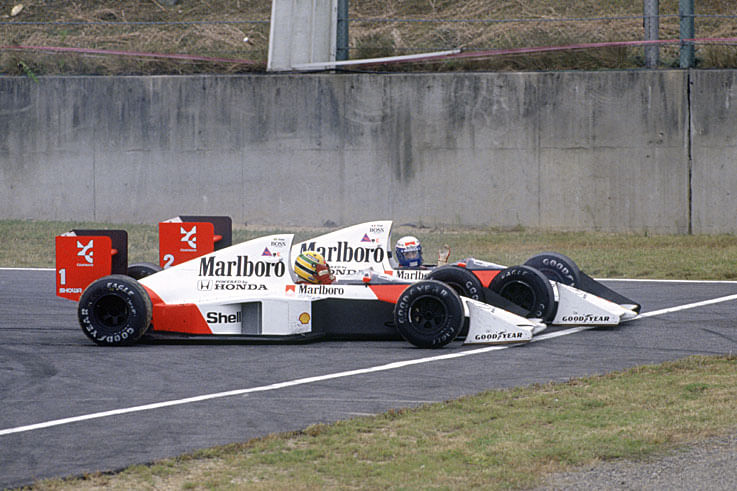 Then came the Japanese Grand Prix, where Senna had to win to secure the championship, whereas Prost’s only chance to win the championship hinged on Senna not finishing the race. When the race began Prost took the lead early on, but on lap 46 at the Casino chicane, both drivers collided and ran off the track.