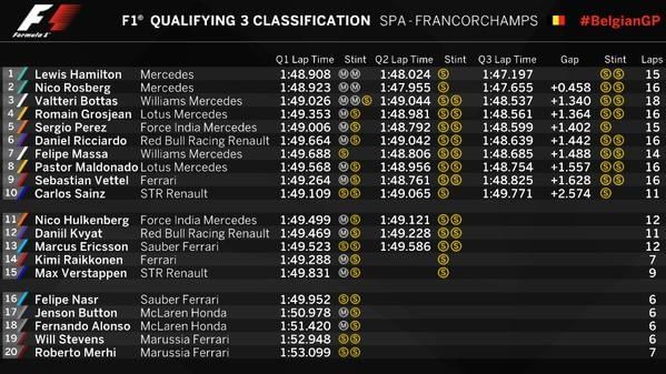 Scuderia Ferrari, however, did not fare well. 4-time world champion Sebastian Vettel did well initially, but floundered by the end of Q3 to qualify in 9th position behind the Lotus of Pastor Maldonado. Kimi Raikkonen, hailed as the ‘King of Spa’, had an early end to qualifying as he suffered power issues yet again. Ferrari said the issue was related to ‘oil pressure’ but no more details were available at the time. He has suffered several power unit issues this year, and it appears the vehicle has let him down again.