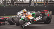 On the race restart (on Lap 30), Hülkenberg looked to be pulling away, but Button had flat spotted his front tyres and was soon re-passed by Hamilton. Hamilton then set about reeling in Hülkenberg and finally took back the lead on the 48th lap when the Force India literally drifted around the corner at Laranja. The rain continued to be spotty and when another sprinkling fell, we saw the front two drivers close together. And again, when Hülkenberg tried to come up on the inside of Hamilton, coming into turn one and ended up sliding right into the McLaren, taking Hamilton out of the race, his final race with McLaren.