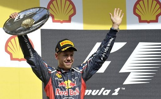Red Bull Racing’s German driver Sebastian Vettel celebrates on the podium at the Spa-Francorchamps circuit in Spa during the Belgium Formula One Grand Prix. Jenson Button claimed his second win this year and 14th of his career when he drove to a comprehensive victory in an incident and accident-packed Belgian Grand Prix.