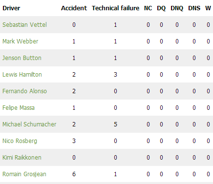 To give you a better insight into each driver’s performance, here is the number of retirements they incurred due to accidents or technical failures. Most notable being Michael Schumacher’s five technical failures and Nico Rosberg’s none.