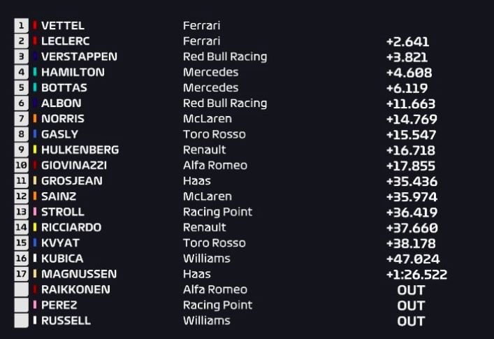 The restart would see Vettel lead the line with Leclerc behind followed by Verstappen, Hamilton and Bottas, setting up an interesting second period of the race.
