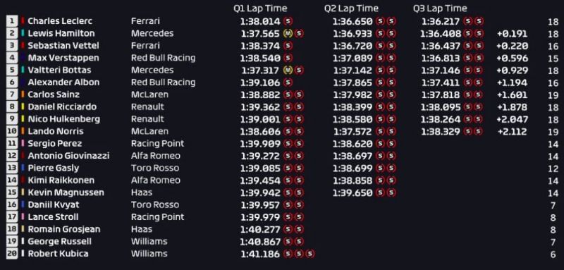 Valtteri Bottas was 5th fastest while Alexander Albon finished 6th and will start alongside the Finn. As expected, the Ferraris, the Mercedes' and the Red Bulls claimed the top six spots but not many tipped a Ferrari car to start the race from the front, come Sunday's showdown.