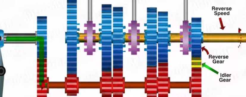 Toe engage reverse gear, the third dog clutch moves to its right to mesh with the reverse gear on the main shaft which rotates in reverse direction using an idle gear, and thus reverse motion is transferred to the gearbox output shaft.