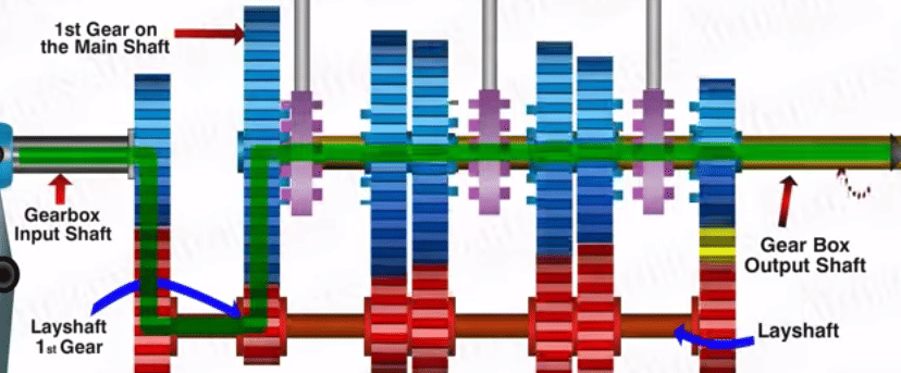 When the first gear is selected using the selector mechanism, the dog clutch shifts towards its left , engaging with the first gear. The power is thus transmitted from the gearbox input shaft tothe layshaft 1st gear, and from there to 1st gear on the main shaft and finally to gearbox output shaft.Since the diameter of the first gear is comparitively biger speed reduces, but torque is increased.
