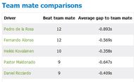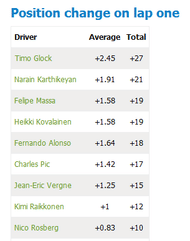 His starts have been brilliant. Ferrari has tuned the launch controls with its drivers and ensured they take maximum advantage in the first corner. The table shows the average position changes on lap one and Alonso has done 19 and his rivals are nowhere to be seen.