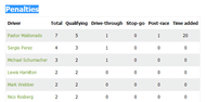 The table below shows the total number of penalties awarded to drivers. While one can easily guess Pastor would be on top of the list, Alonso nowhere to be seen on the list. He is still yet to receive any penalty from the stewards. He hasn’t been penalized for any engine/ gearbox change also. This is significantly important as all his rivals have been penalized for various reasons which have affected their positions.