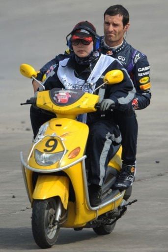 Red Bull driver Mark Webber of Australia gets a ride after his car broke down during qualifying for the Formula One Chinese Grand Prix in Shanghai on April 13, 2013. Lewis Hamilton roared to his first pole position for Mercedes, in a qualifying session at the Chinese Grand Prix in Shanghai that was dominated by tyre strategy.