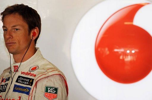 McLaren driver Jenson Button looks out of the garage during the practice session of F1 Chinese Grand Prix in Shanghai on April 12, 2013. Lewis Hamilton roared to his first pole position for Mercedes, in a qualifying session at the Chinese Grand Prix in Shanghai that was dominated by tyre strategy.