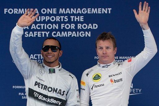 Mercedes driver Lewis Hamilton (left) and Lotus driver Kimi Raikkonen wave following their qualifying session of the Formula One Chinese Grand Prix in Shanghai, on April 13, 2013. Hamilton roared to his first pole position for Mercedes in the qualifying , as the warring Red Bulls had a day to forget.