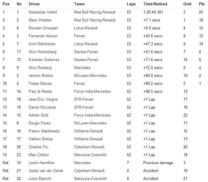Ferrari’s Fernando Alonso and Lotus’s Kimi Raikkonen battled it out at the end of the race to finish fourth and fifth respectively. Nico Hulkenberg (Sauber), Esteban Gutierrez (Sauber), Nico Rosberg (Mercedes), Jenson Button (McLaren) and Felipe Massa (Ferrari) completed the top ten.