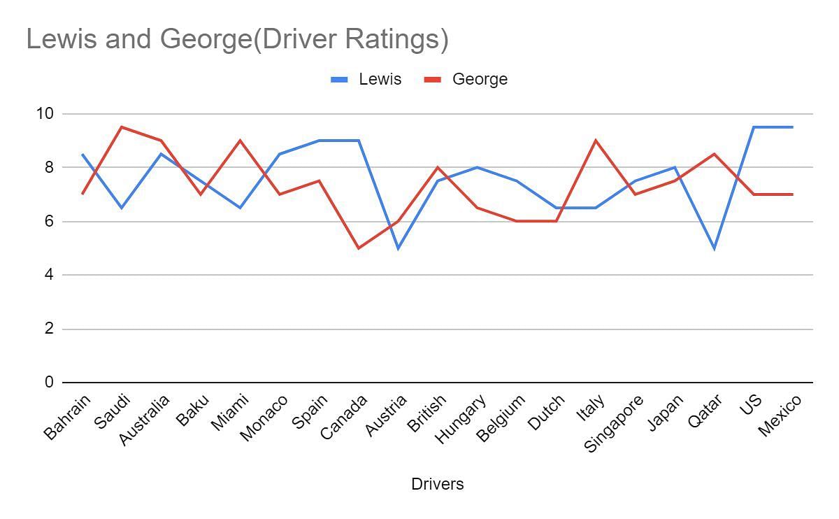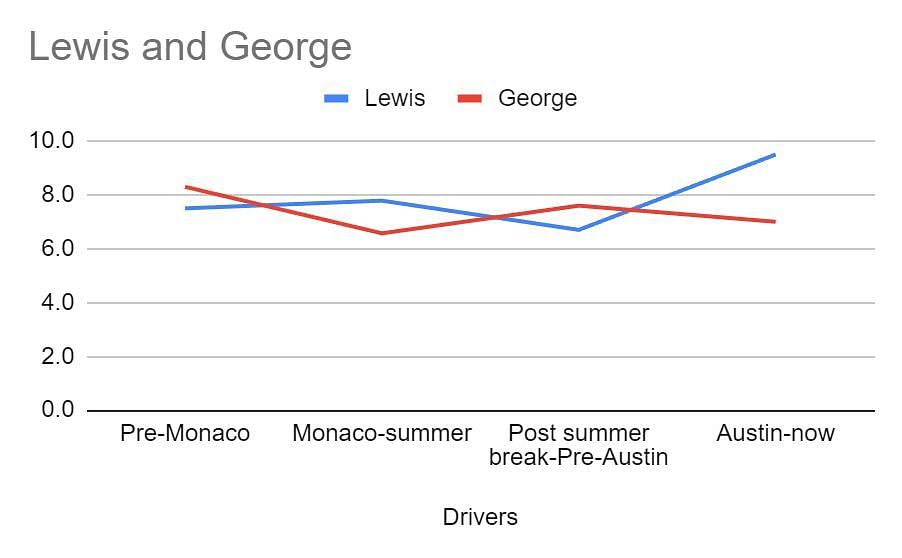 Now if we notice carefully, there is a certain dip in ratings for George Russell and a jump for Lewis Hamilton post-Monaco and post-Austin. These two races are significant because, in both of these events, Mercedes introduced its two major upgrades this season.