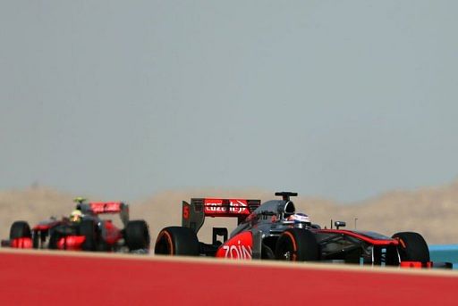 McLaren Mercedes’ Sergio Perez (left) and Jenson Button drive at the Bahrain International Circuit in Manama on April 21, 2013 during the Bahrain Formula One Grand Prix. McLaren team chief Martin Whitmarsh has moved swiftly to defuse a possible feud between the two drivers after Button accused team-mate Perez of dangerous driving during the race.