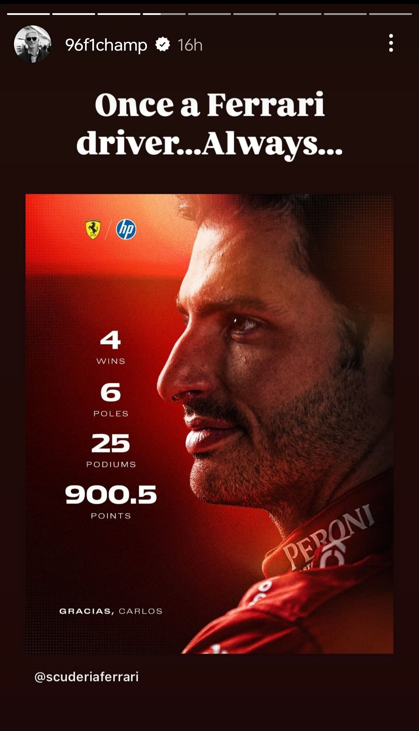 Celebrating his achievements, Scuderia Ferrari shared a post from their official Instagram account, showcasing Sainz's accomplishments across the four seasons.