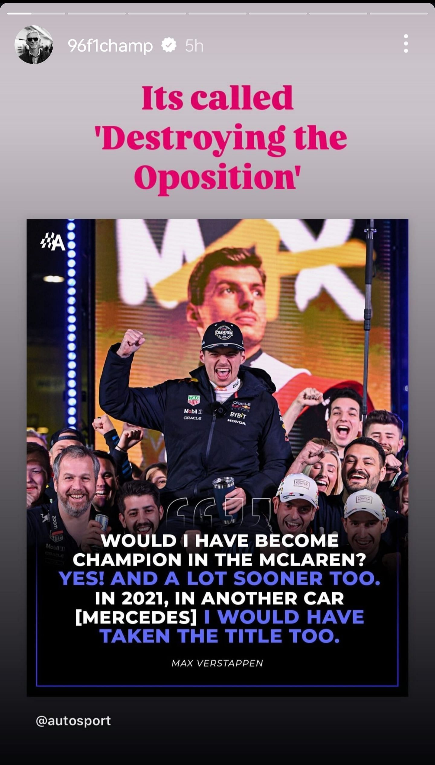 Interestingly, Verstappen also mentioned that he would have claimed the title in Hamilton's Mercedes from the 2021 F1 season. Hill, sharing the quote from Verstappen on his Instagram, wrote: