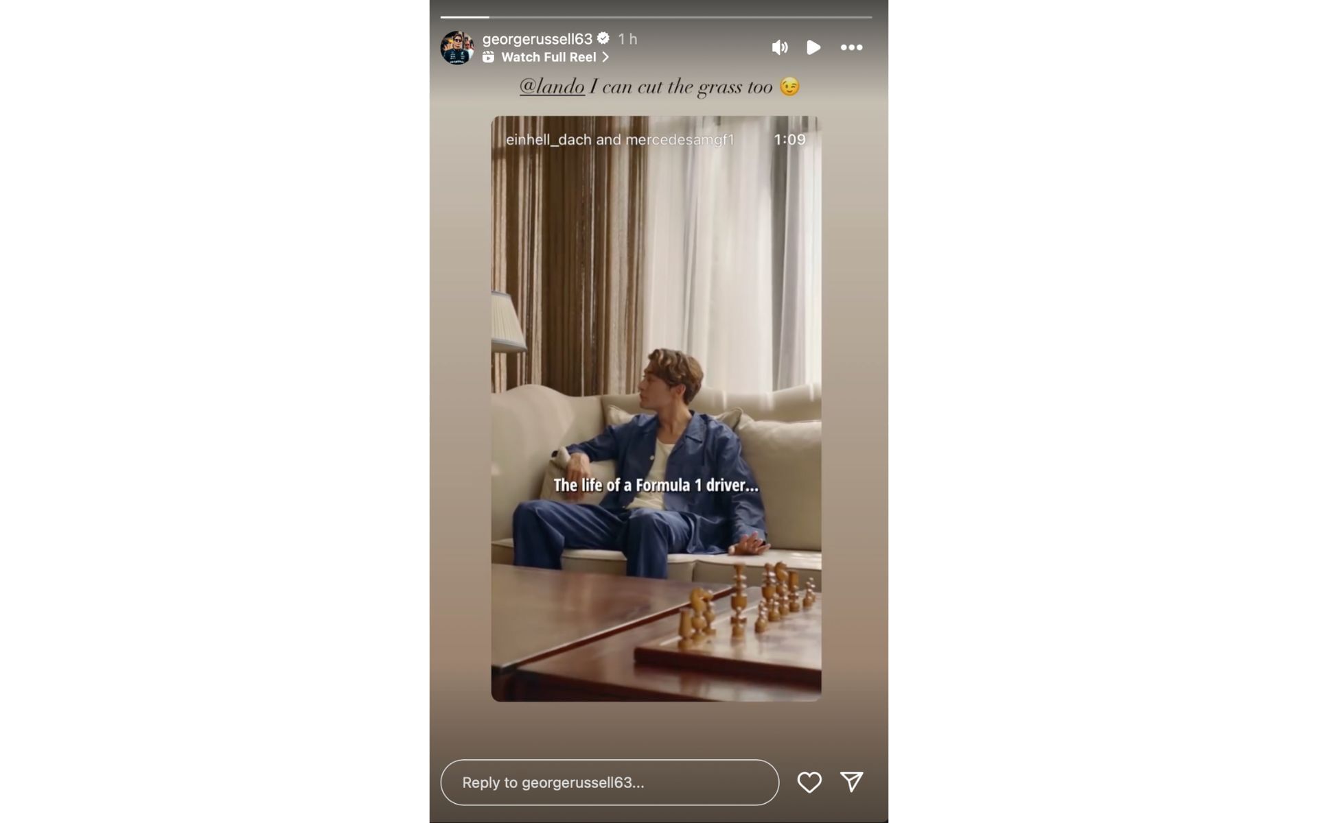 Subsequently, many took a jibe at the McLaren driver's off-track driving, and George Russell became the latest addition to the list of people taking a jibe at his colleague. The 27-year-old re-posted his reel with a German gardening equipment producer and captioned the story: