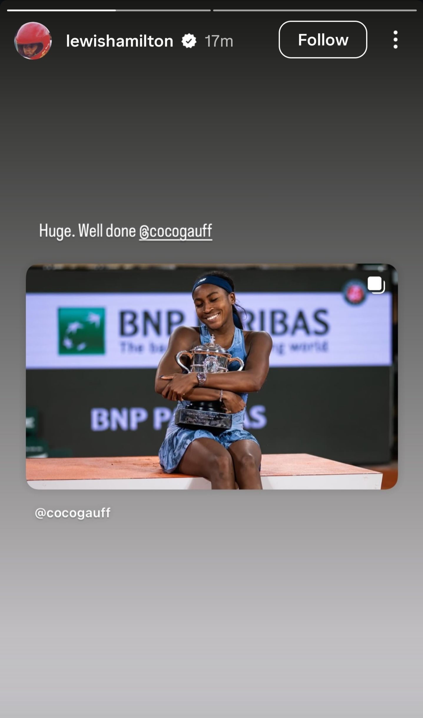 Lewis Hamilton congratulated Coco Gauff after her impressive win at the 2025 French Open. Hamilton, from his official Instagram account, shared a post of Gauff on his story and congratulated her with a "well done" message.