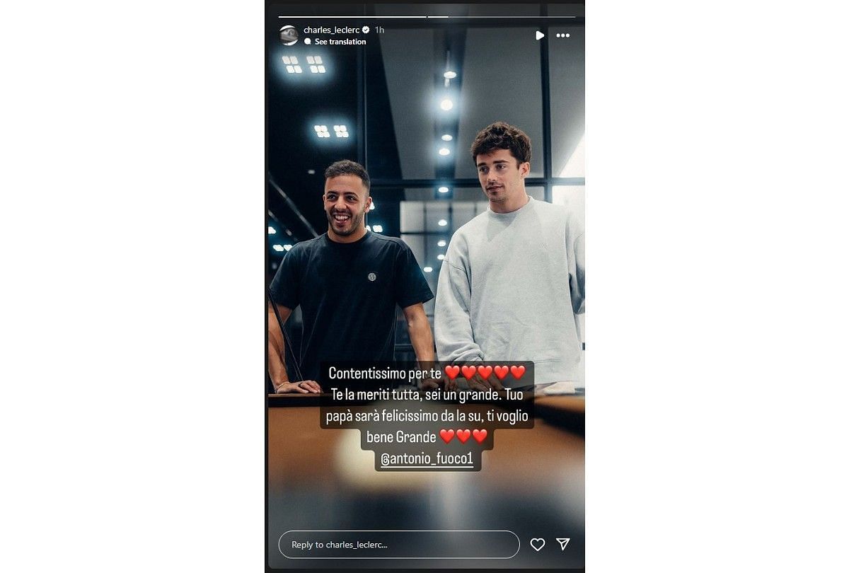 Ferrari F1 driver Charles Leclerc congratulated fellow Ferrari WEC driver Antonio Fuoco with a heartwarming message. The latter won the 24 Hours of Le Mans earlier today, marking the team's second consecutive victory in the competition.