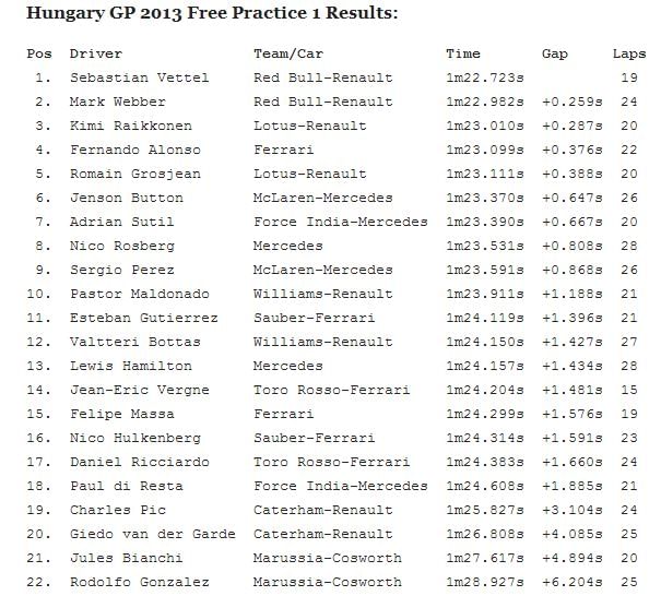 It was a Red Bull one-two during FP1 at the Hungaroring as Vettel beat team-mate Mark Webber by a quarter of a second amid high track temperatures. A brake issue meant Vettel took a while to finally set a competitive time, having been told earlier in the session that he had “an anomaly with the brake system” and completed a lap without using the brakes before pitting.