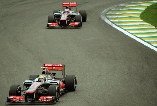 British Formula One driver Lewis Hamilton powers his McLaren followed by teammate Jenson Button during the Brazil’s F-1 GP at the Interlagos racetrack in Sao Paulo, Brazil. Sebastian Vettel became the youngest triple champion in Formula One history on Sunday when he finished sixth behind the victorious Button in a tumultuous Brazilian Grand Prix.