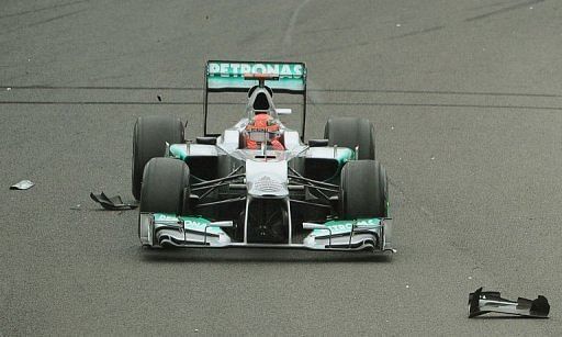 German Formula One driver Michael Schumacher passes over debris from Mark Webber’s car during the Brazil F1 GP at the Interlagos racetrack in Sao Paulo, Brazil. Sebastian Vettel became the youngest triple champion in Formula One history on Sunday when he finished sixth behind the victorious Jenson Button in a tumultuous Brazilian Grand Prix.